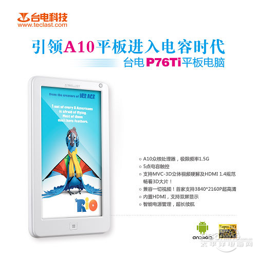 台电P76Ti支持MVC-3D立体视频硬解,并且支持HDMI 1.4规范标准。我们可通过台电P76Ti播放MVC-3D立体视频,并通过HDMI输出到电视机上,享受3D影院的震撼效果!