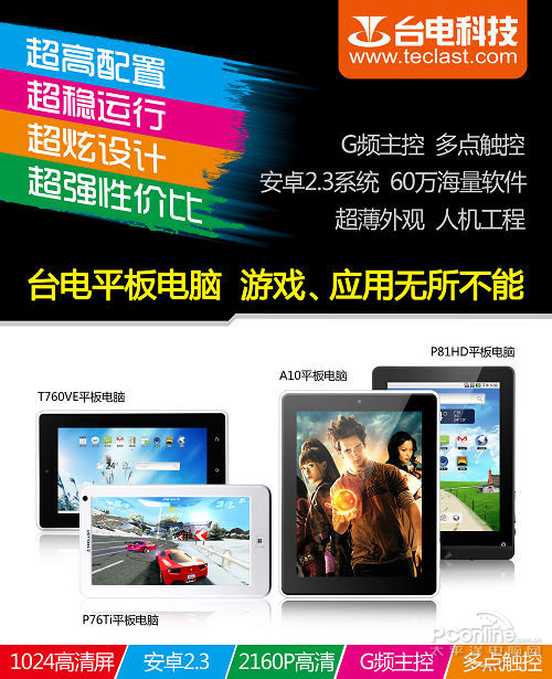 总结:台电P76Ti延续了P76Ti的强大A10主控优势和强大的配置,搭载的优势目前最为成熟的Android2.3系统,还将率先提供对安卓4.0系统的支持,硬件和软件性能都是无与伦比的优异。7寸5点触摸高清屏幕,操作非常灵敏和精确,800*480高分辨率,画面表现逼真又细腻。支持高达2160P的超高清视频的播放,即时是PC也为之汗颜,支持MVC-3D立体视频硬解,并且支持HDMI 1.4规范标准,让用户可以畅享3D视觉盛宴。同时,电子书,网络、游戏娱乐等方面也是表现优异,种种优异性能,但却只要499的费用,作为台电科技对热门产品P76Ti的升级,价格仍然保持在499元的没有上涨,其超高性价比必定会带来极佳的市场收益。